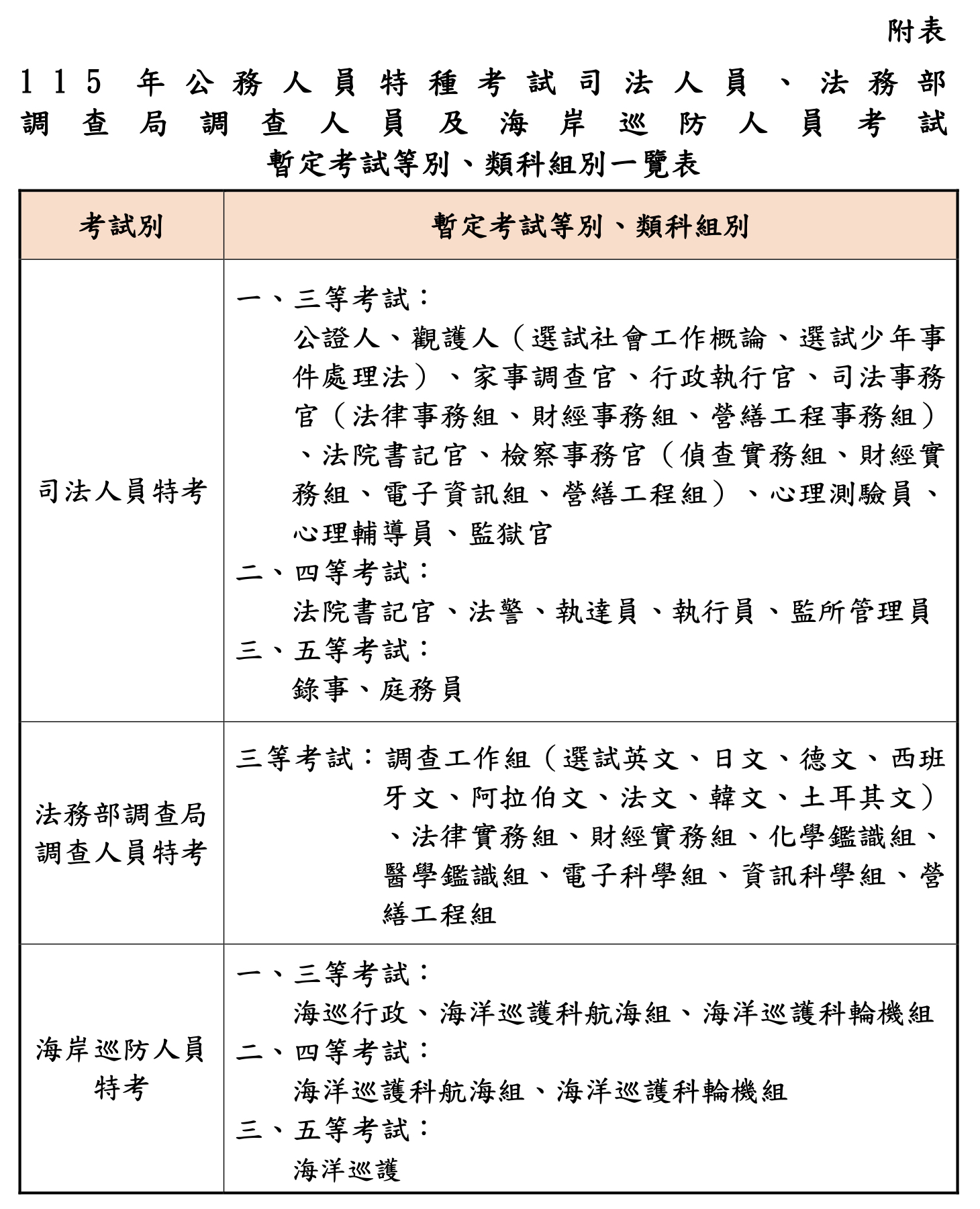 115年司法、調查及海巡特考暫定考試類科組別115年公務人員特種考試司法人員、法務部調查局調查人員及海岸巡防人員考試預定於115年4月28日至5月7日受理報名,8月8日至10日舉行考試,依據銓敘部及行政院人事行政總處彙整司法院、法務部、海洋委員會之任用計畫,本考試暫定考試等別、類科組別詳如附表。 考選部表示,為利有意報考本考試應考人及早因應準備,先依據請辦考試機關銓敘部及行政院人事行政總處來函發布預定舉辦考試之等別、類科組別,但仍須俟請辦考試計畫經考試院會議審議通過後,再另予公告確定之考試類科組別及其暫定需用名額等考試資訊。 相關檔案