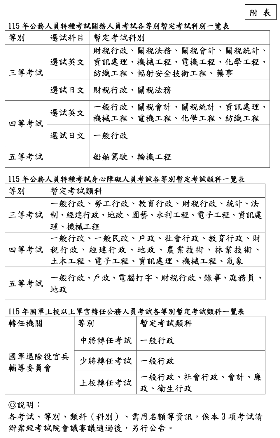 115年關務人員、身心障礙人員特考及國軍上校以上軍官轉任公務人員考試暫定考試類科115年公務人員特種考試關務人員、身心障礙人員考試及國軍上校以上軍官轉任公務人員考試預定於114年12月22日至12月31日受理報名,115年4月18日至4月19日舉行考試,依據銓敘部及行政院人事行政總處彙整之任用計畫,本3項考試各等別暫定考試類科詳如附表。 考選部表示,為利應考人及早因應準備,先依據分發機關銓敘部及行政院人事行政總處來函發布預定舉辦考試之類科及需用名額等考試資訊,但仍須俟請辦考試計畫經考試院審議通過後,再據予公告確定之考試資訊。