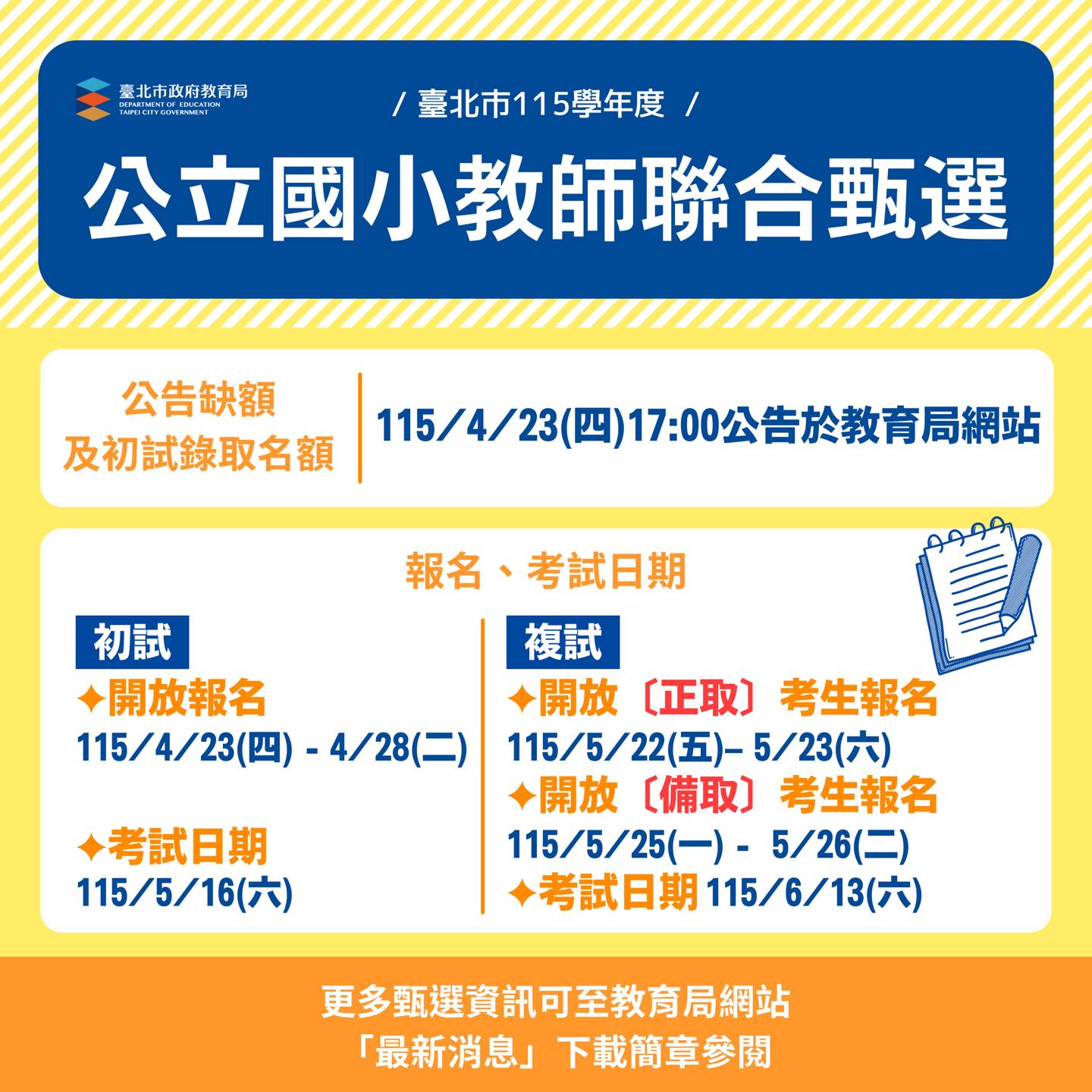 北市教育局誠摯邀請熱愛教育、關心孩子成長的教師加入臺北教育團隊,一起為孩子打造更優質的學習環境 「臺北市115學年度公立國小教師聯合甄選」報名資訊